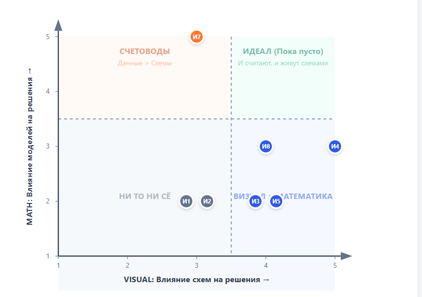 В итоге поговорили с 8 пользователями. Закодировали результаты, и собрали код-бук, который прямо в рабочем виде отдали заказчику: он отлично знал, что с ним делать дальше. Так же сделали профилирование пользователей, которое показало еще одну глобальную цель продукта: тащить пользователей из левого верхнего и правого нижнего квадрантов наверх вправо. То есть наметился образовательный слой будущего интерфейса.