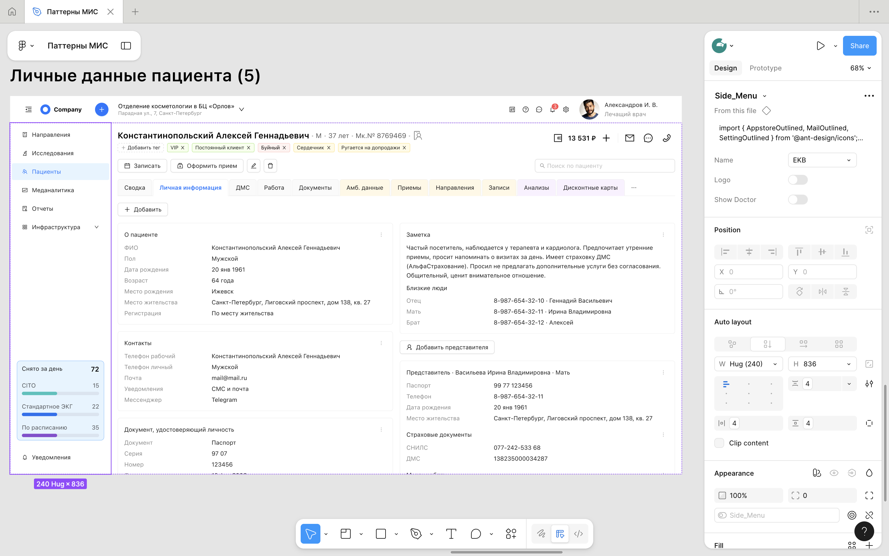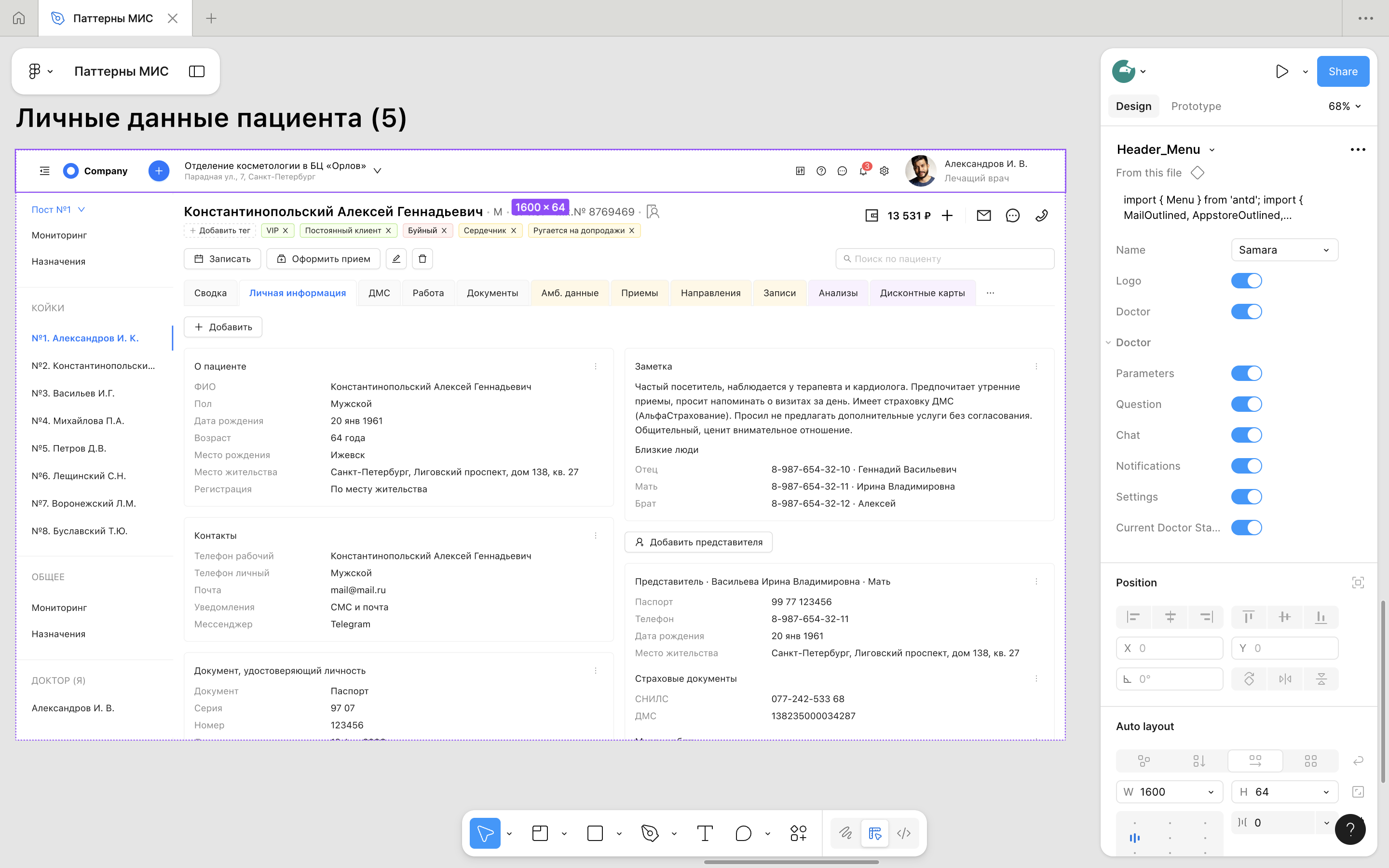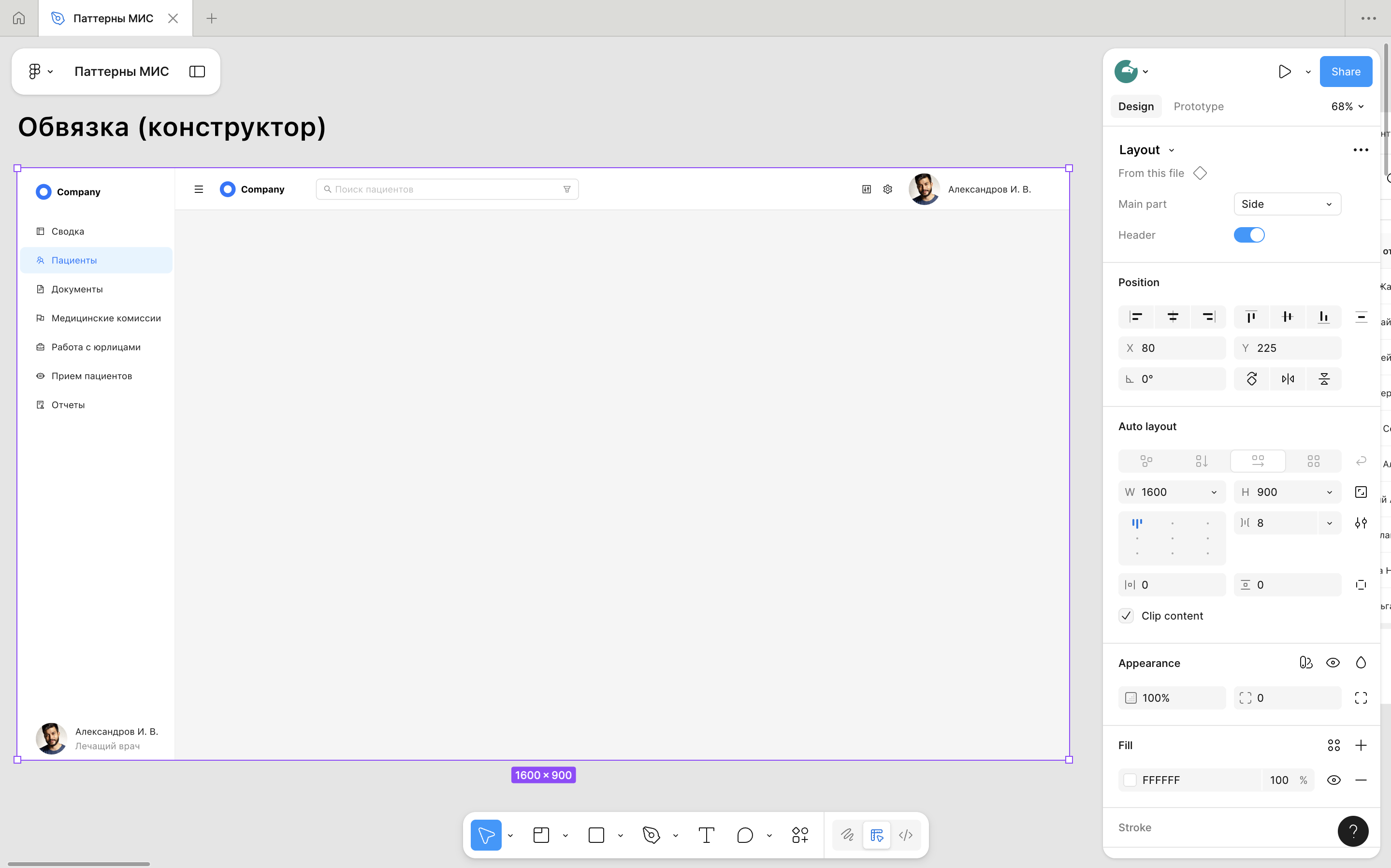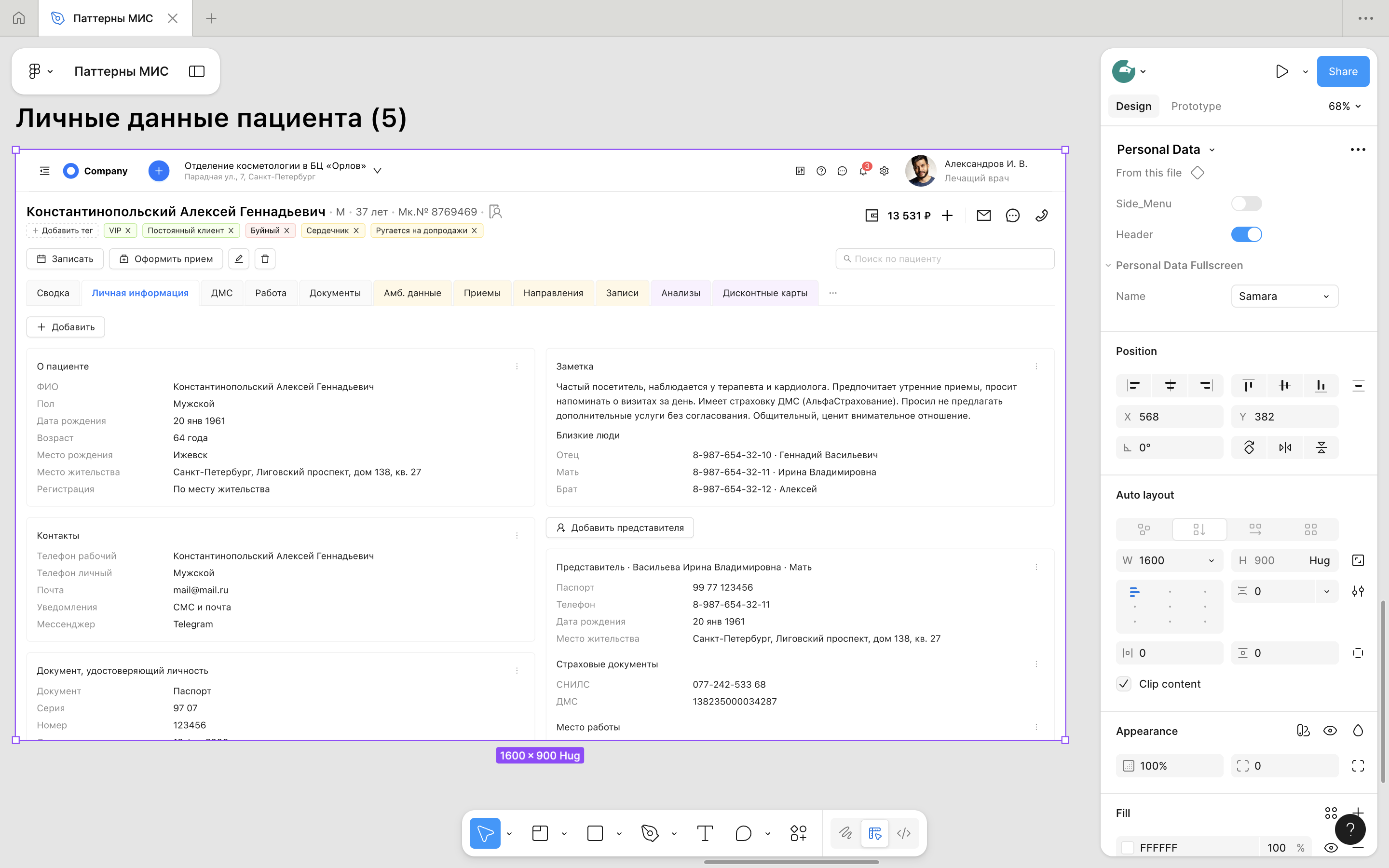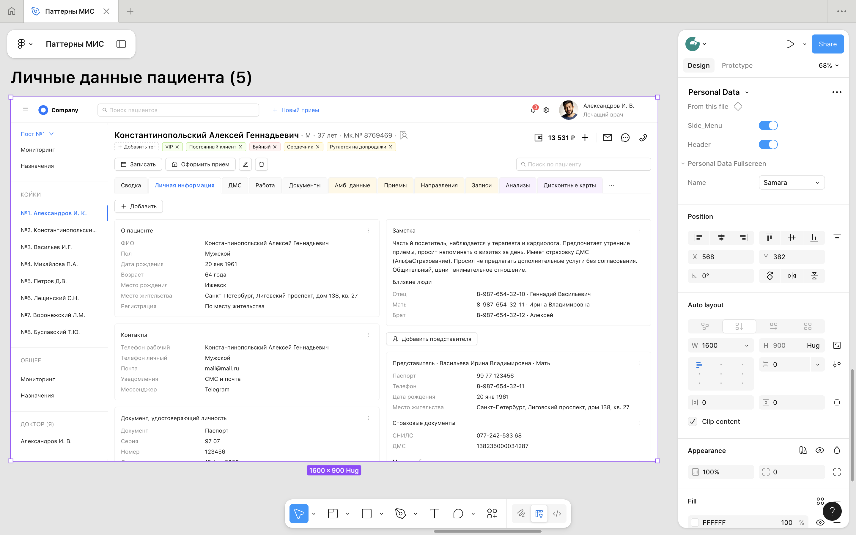 Мы собрали в Фигме конструктор медицинских интерфейсов. Он состоит из наших лучших дизайн-решений для медицинских информационных систем. Теперь, когда в «Собаку Павлову» за интерфейсом приходят разработчики из медицины, мы ищем и собираем концептуальные решения в этом конструкторе. Это первый шаг в дизайне МИС.